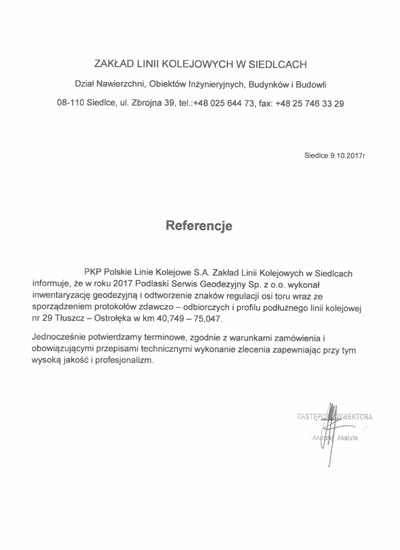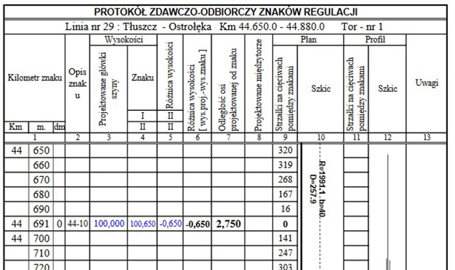 - Profile linii kolejowej i protokoły zdawczo-odbiorcze znaków regulacji